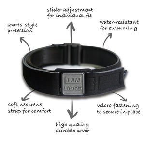 Stylish adjustable black neoprene strap with pewter coloured cover featuring I AM LIBR3 motif.