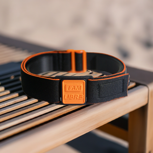 Libreband for FreeStyle Libre 3 CGM with Special Edition I AM LIBR3 wording on orange cover with black neoprene strap.